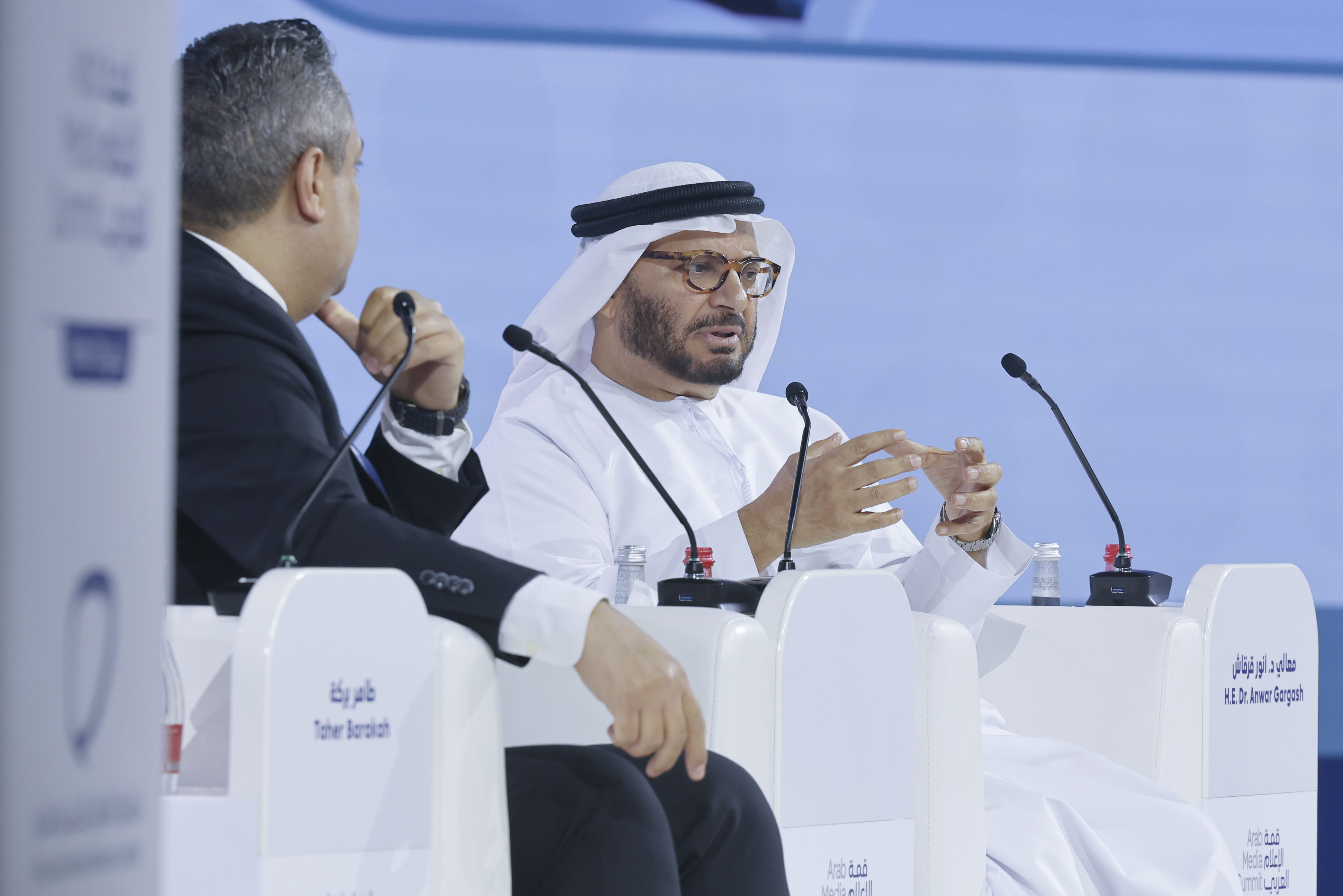 Her Excellency Mona Ghanem Al Marri, Vice Chairperson and Managing Director of the Dubai Media Council, President of the Dubai Press Club, and Chairperson of the Organising Committee of the Arab Media Summit, also attended the session. The dialogue with HE Dr. Gargash was moderated by Taher Barakah of Al Arabiya news channel.