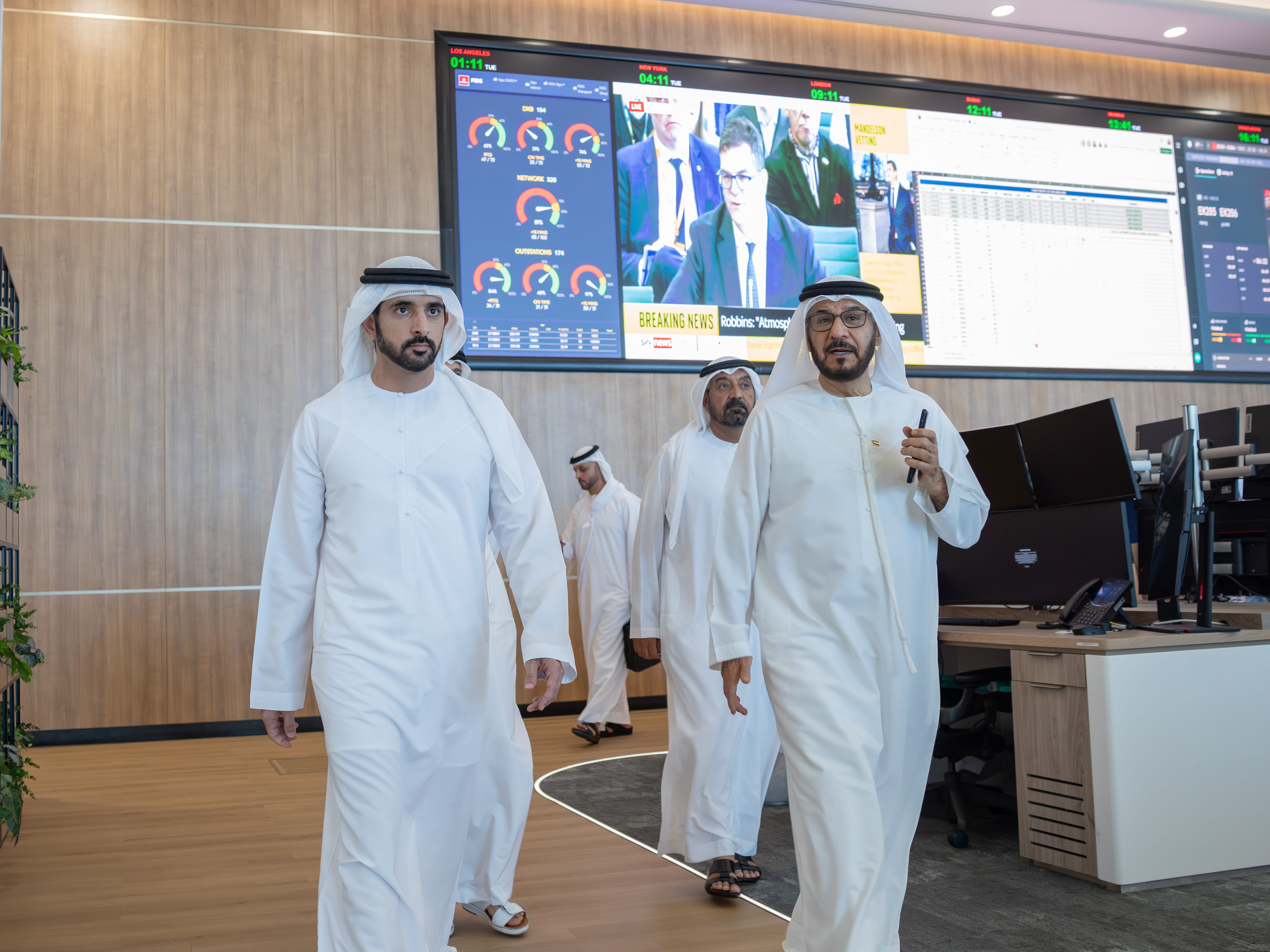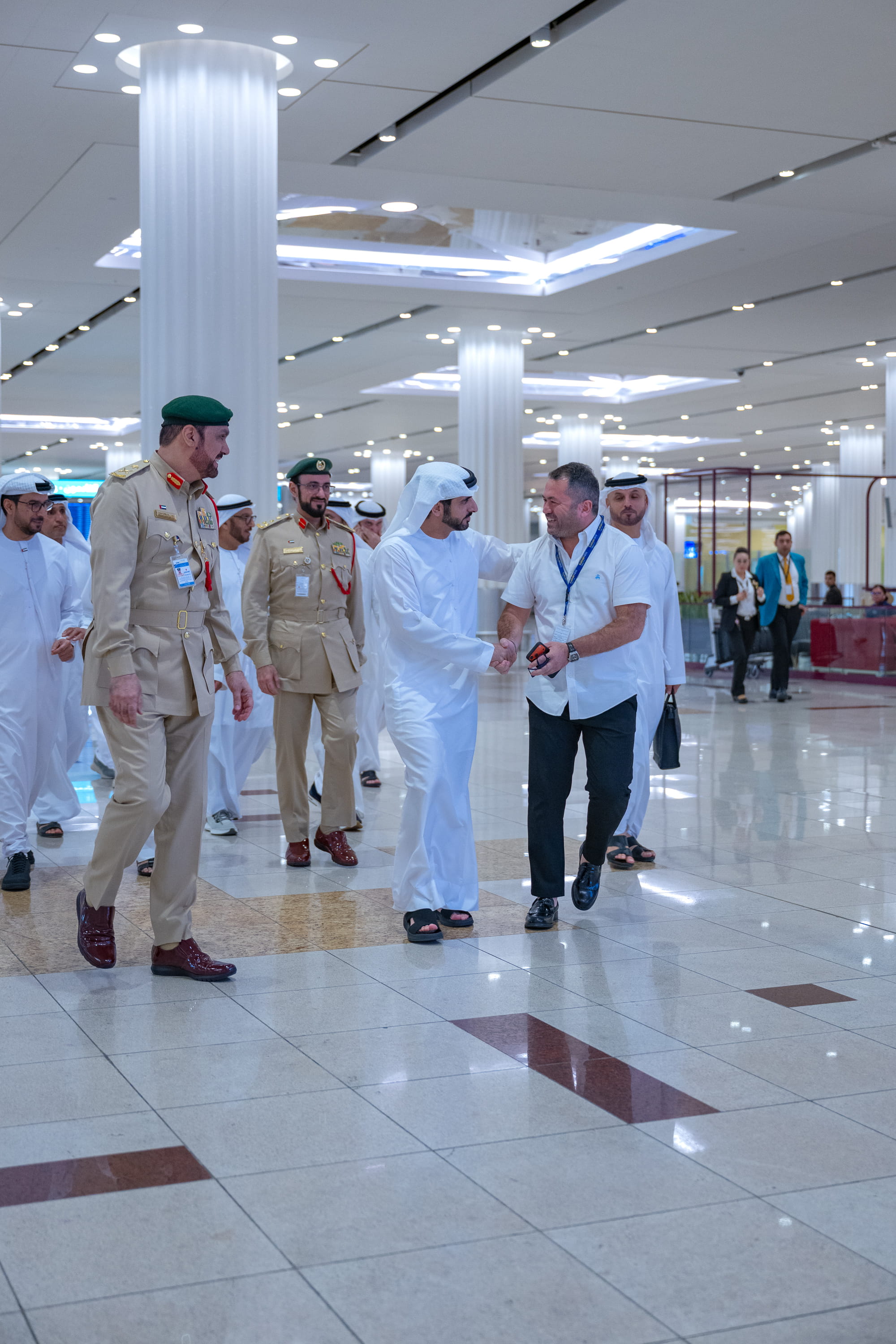 His Highness Sheikh Hamdan, accompanied by His Highness Sheikh Ahmed bin Saeed Al Maktoum, reviewed operations at Dubai International Airport, including passenger services provided by Emirates. He also visited the Dubai Police operations centre and was briefed on its role in safeguarding the airport and enhancing travel safety through advanced smart services. His Highness was also briefed on ongoing smart technology upgrades to promote efficiency, ensure seamless passenger flow, expedite travel procedures and enhance passenger comfort.