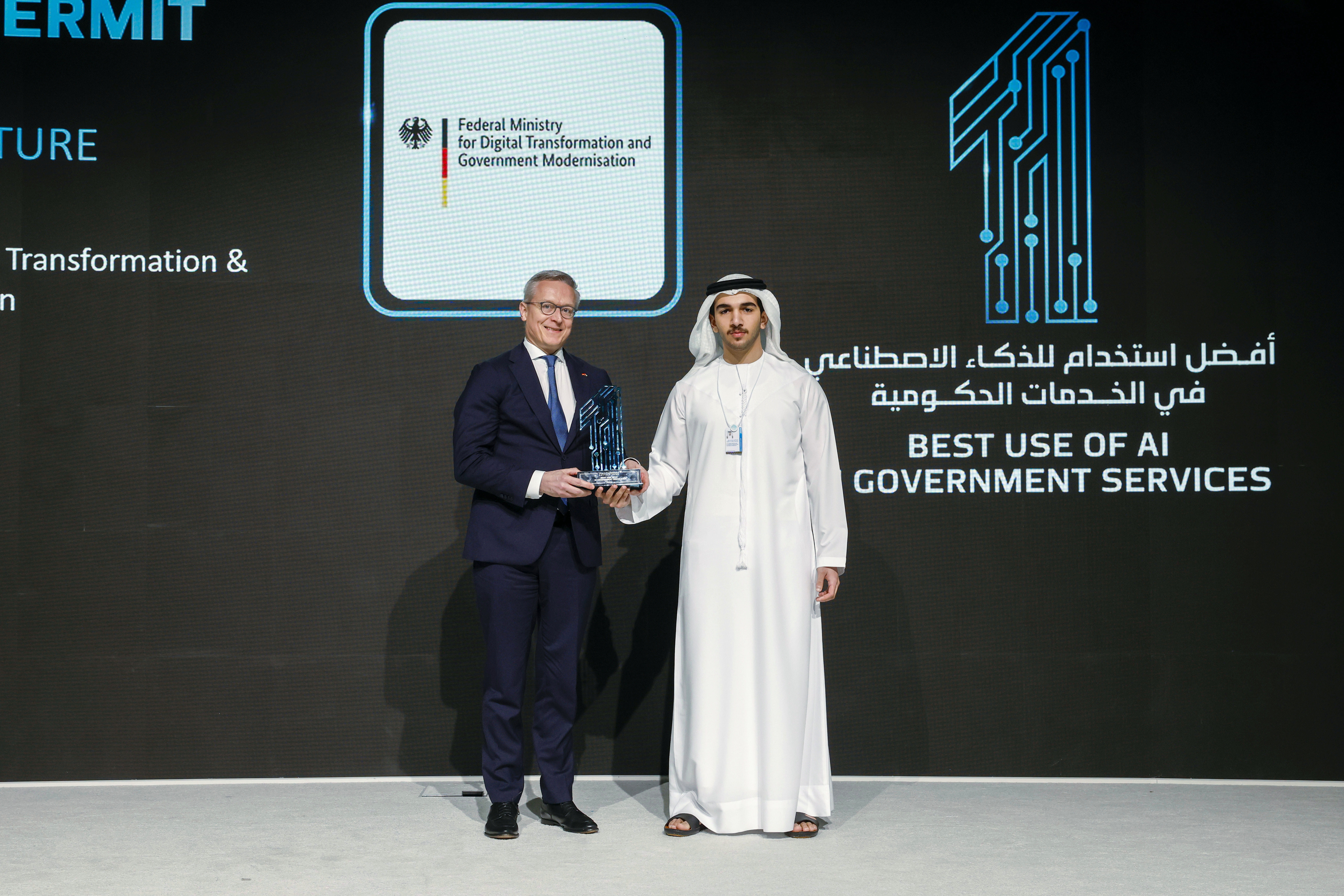 During the ceremony, His Highness recognised Germany’s Federal Ministry for Digital Transformation and Government Development with the ‘Best Use of AI in Government Services’ award for its AI-powered infrastructure permit platform that secured it the GovTech Prize.