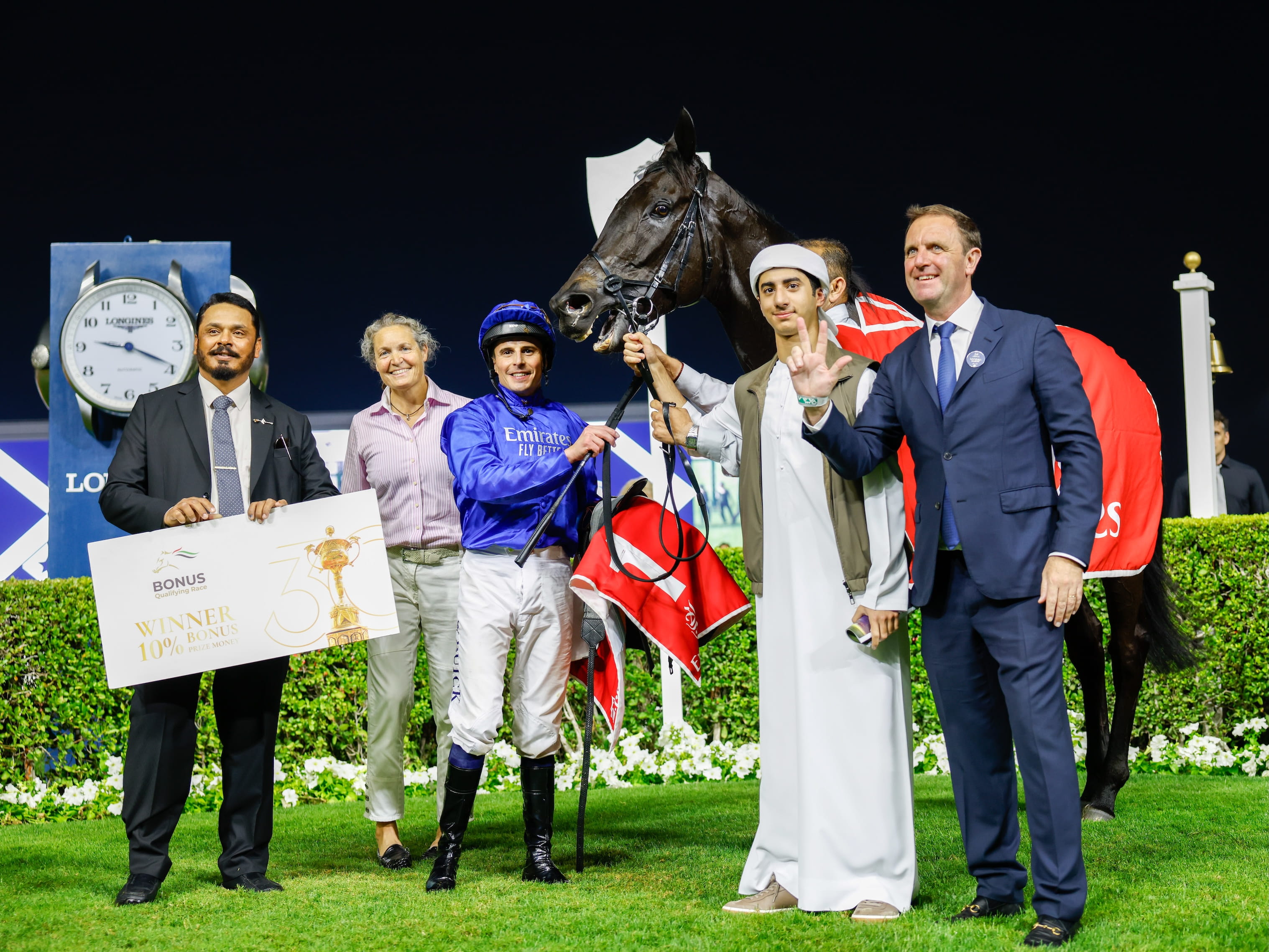 Quddwah, also owned by HH Sheikh Ahmed bin Rashid Al Maktoum produced an outstanding performance to claim the G2 Singspiel Stakes, sponsored by Emirates Airline, over 1,800 metres on turf. The winner edged out Dividend who finished a close second under jockey Rossa Ryan for trainers Dr. Richard Newland and Jamie Insole.